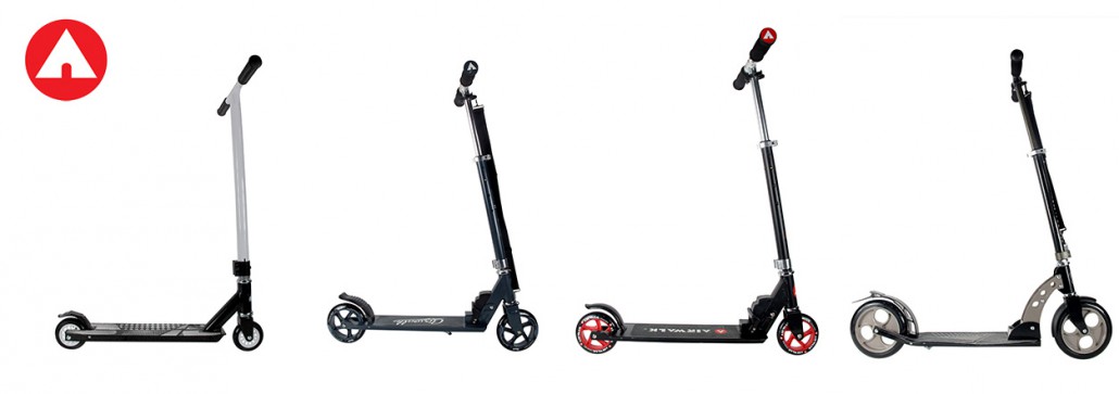 I monopattini Airwalk, quattro modelli che spaziano dal modello Urban, pieghevole con ruote da 125mm e cuscinetti ABEC 5 fino al modello Stunt, non pieghevole, con una struttura capace di sopportare gli abusi dell’ impiego in street e rampa, passando per i modelli URBAN con ruote da 180mm e da 200mm, sempre con cuscinetti ABEC5.
